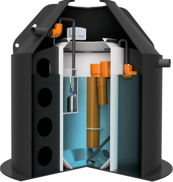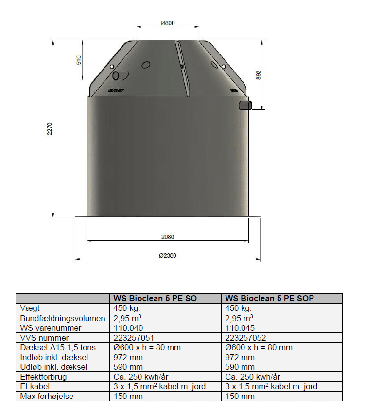 ws-bioclean™ minirenseanlæg med integreret bundfældningstank, udført i kvalitetsplast med GPRS overvågningsfunktion. Kun ét synligt Ø600 dæksel (A15, 1,5 tons) og minimal lugt og støj.